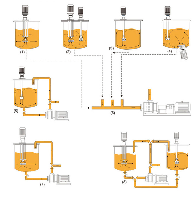 工作原理: 高剪切均質(zhì)乳化機(jī)就是高效、快速、均勻地將一個相或多個相分布到另一個連續(xù)相中,而在通常情況下各個相是相互不溶的,由于轉(zhuǎn)子高速旋轉(zhuǎn)所產(chǎn)生的高切線速度和高頻機(jī)械效應(yīng)帶來的強(qiáng)勁動能,使物料在定、轉(zhuǎn)子精密吻合的間隙中受到強(qiáng)烈的機(jī)械及液力剪切、離心擠壓、液層摩擦、撞擊撕裂和湍流等綜合作用,與此同時在轉(zhuǎn)軸上高速旋轉(zhuǎn)的分散輪的作用,又形成上、下兩股強(qiáng)烈的翻動湍流。從而使不相溶的固相、液相、氣相在相應(yīng)成熟工藝和適量添加劑的共同作用下,瞬間均勻精細(xì)地分散、均質(zhì)、乳化,罐內(nèi)物料經(jīng)過高頻率的上下翻滾和循環(huán)往復(fù),最終得到穩(wěn)定且品質(zhì)高的物料產(chǎn)品。